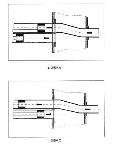 當(dāng)混凝土活塞8后退至行程終端時(shí),觸發(fā)水箱3中的換向裝置4,主油缸1、2換向,同時(shí)擺動(dòng)油缸12、13換向,使分配閥10與混凝土缸6連通,混凝土缸5與料斗連通,這時(shí)活塞7后退,8前進(jìn)。如此循環(huán),從而實(shí)現(xiàn)連續(xù)泵送。反泵時(shí),通過反泵操作,使處在吸入行程的混凝土缸與分配閥連通,處在推送行程的混凝土缸與料斗連通,從而將管路中的混凝土抽回料斗(如圖所示)